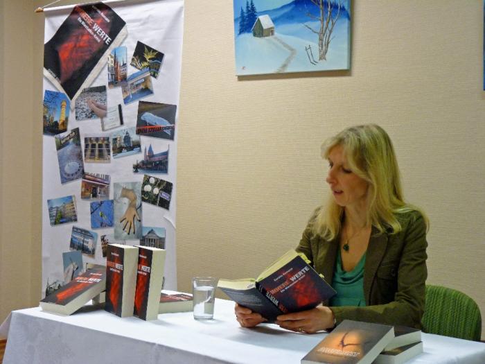 Kriminalautorin Kerstin Hamann stellte am 15. März 2013 im Rahmen einer Autorenlesung ihren neuesten Roman „Innere Werte“ in der Leihbücherei im Gemeindehaus Alte Schule vor.