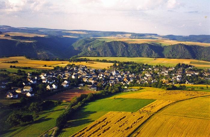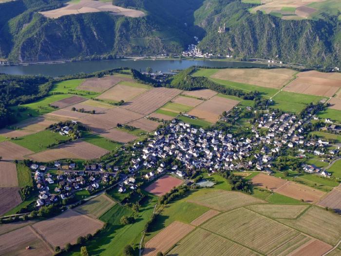 Luftbildaufnahme des Rheinhöhenortsteils Werlau. Im Hintergrund erkennt man die Burg Maus. Foto: Ingo Rabe